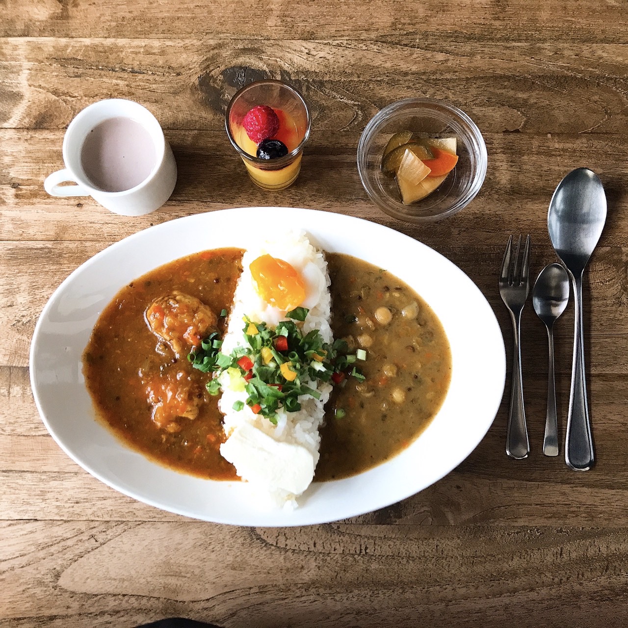 寒いこの時期のお昼ご飯に、身体がぽかぽか温まる“カレーセット”はいかが?油・小麦粉・白砂糖を使用せず、野菜の甘みを活かしたこだわりのカレーは、5種類の中から自分好みの2種を選んでカスタマイズ!嬉しいスープ・ピクルス・プチデザート付き!