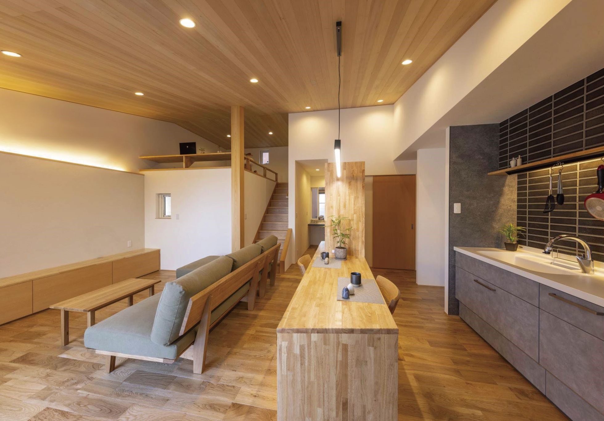 リビングにビルトインガレージの上の空間を有効活用し、スキップフロアを導入しました。この巧妙なデザインにより、玄関からリビングに足を踏み入れた瞬間、視線が開け、16帖以上の広がりを感じることができます。床には質の高いムク材が使用され、勾配天井には丁寧に施された羽目板が木の温もりを演出して心地の良いあたたかな空間が広がっています。外観においては、片流れの屋根と木格子の組み合わせが全体のバランスを引き締め、洗練された和モダンな雰囲気を演出。そして最大の特徴は、無駄のないコンパクトデザインにあります。機能的かつ美しいデザインが見事に融合し、高い住宅性能が実現されました。